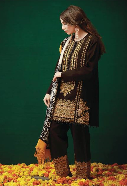 Khaadi KO18403 Black khaddar Embroidered three piece With Wool Shawl